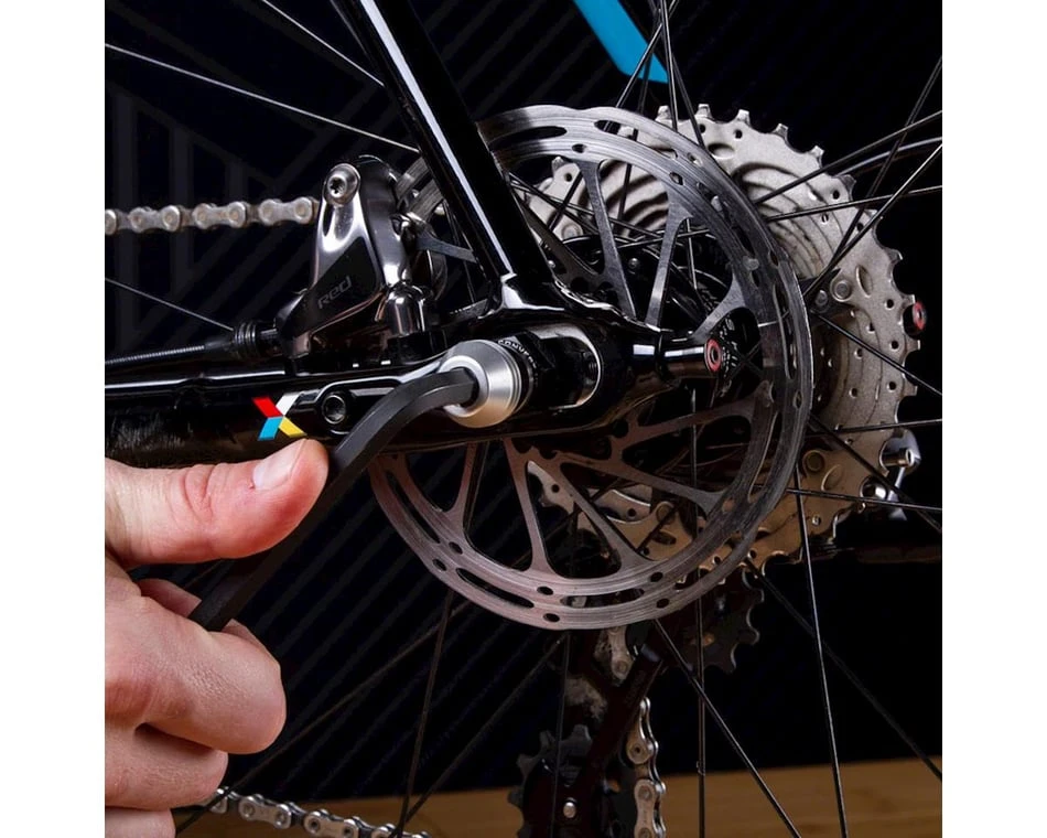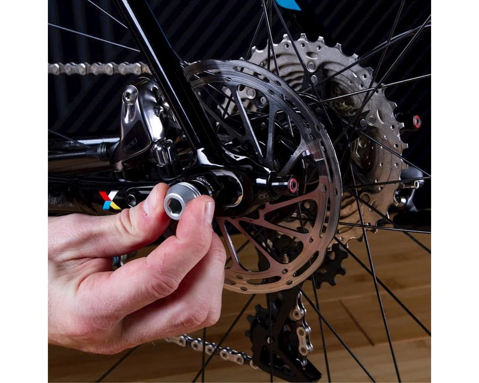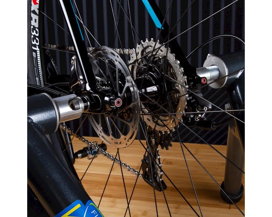 Wolf Tooth axle trainer caps allow for rear, Wolf Tooth-branded, 12mm thru axles to work with most training stands.