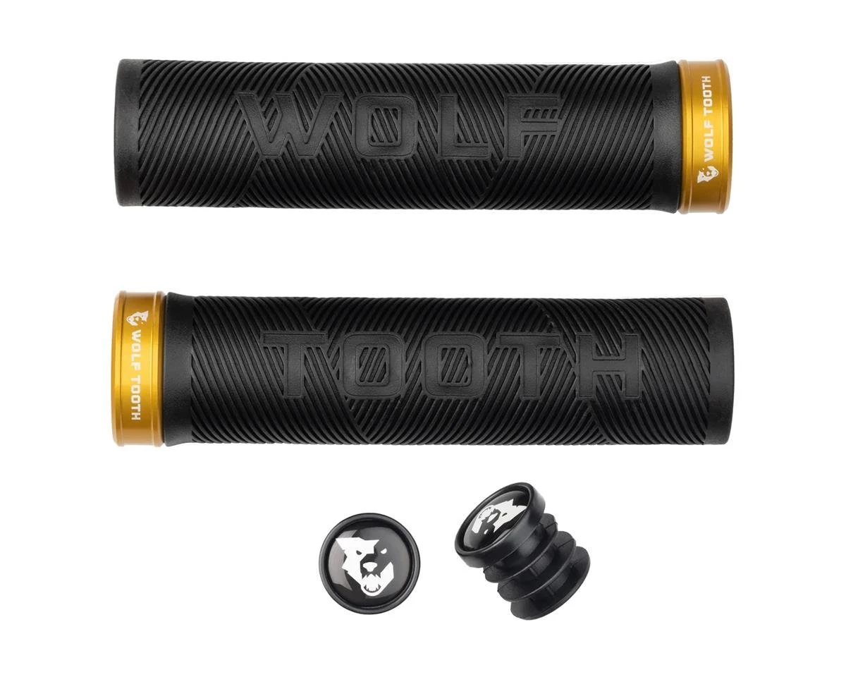 Wolf Tooth Components Echo Lock-On Grips are soft and tacky. Made with black molded rubber, these grips are available with a colorful variety of anodized aluminum collars to match other Wolf Tooth parts. An alternating diagonal grip pattern is comfortable on the hands with or without gloves. Sold in pairs.