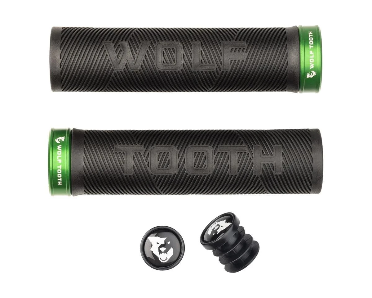 Wolf Tooth Components Echo Lock-On Grips are soft and tacky. Made with black molded rubber, these grips are available with a colorful variety of anodized aluminum collars to match other Wolf Tooth parts. An alternating diagonal grip pattern is comfortable on the hands with or without gloves. Sold in pairs.