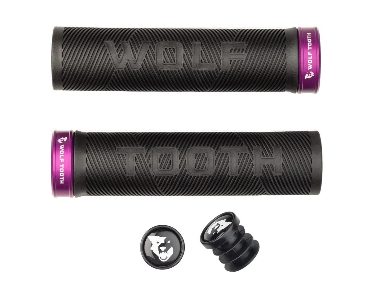 Wolf Tooth Components Echo Lock-On Grips are soft and tacky. Made with black molded rubber, these grips are available with a colorful variety of anodized aluminum collars to match other Wolf Tooth parts. An alternating diagonal grip pattern is comfortable on the hands with or without gloves. Sold in pairs.