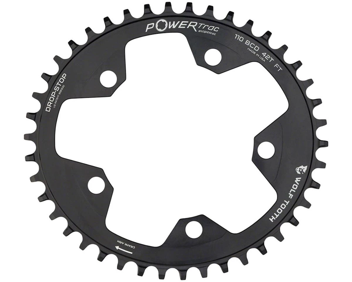 Designed for 110 BCD Cranksets. The proprietary design has an ovality of 10% and a timing of 112 degrees after top dead center which provide the benefits of an oval ring without the traditional downsides of oval rings. This chainring features the patent-pending asymmetrical Drop-Stop tooth design for the best in wear life, mud clearance, and chain retention.