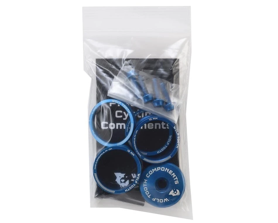 Add style to your bike with the Wolf Tooth Anodized Bling Kit. Including headset spacers of varied sizes, a matching stem cap, and four aluminum water bottle cage bolts, these precision machined aluminum parts will bring a lot of style to your ride.