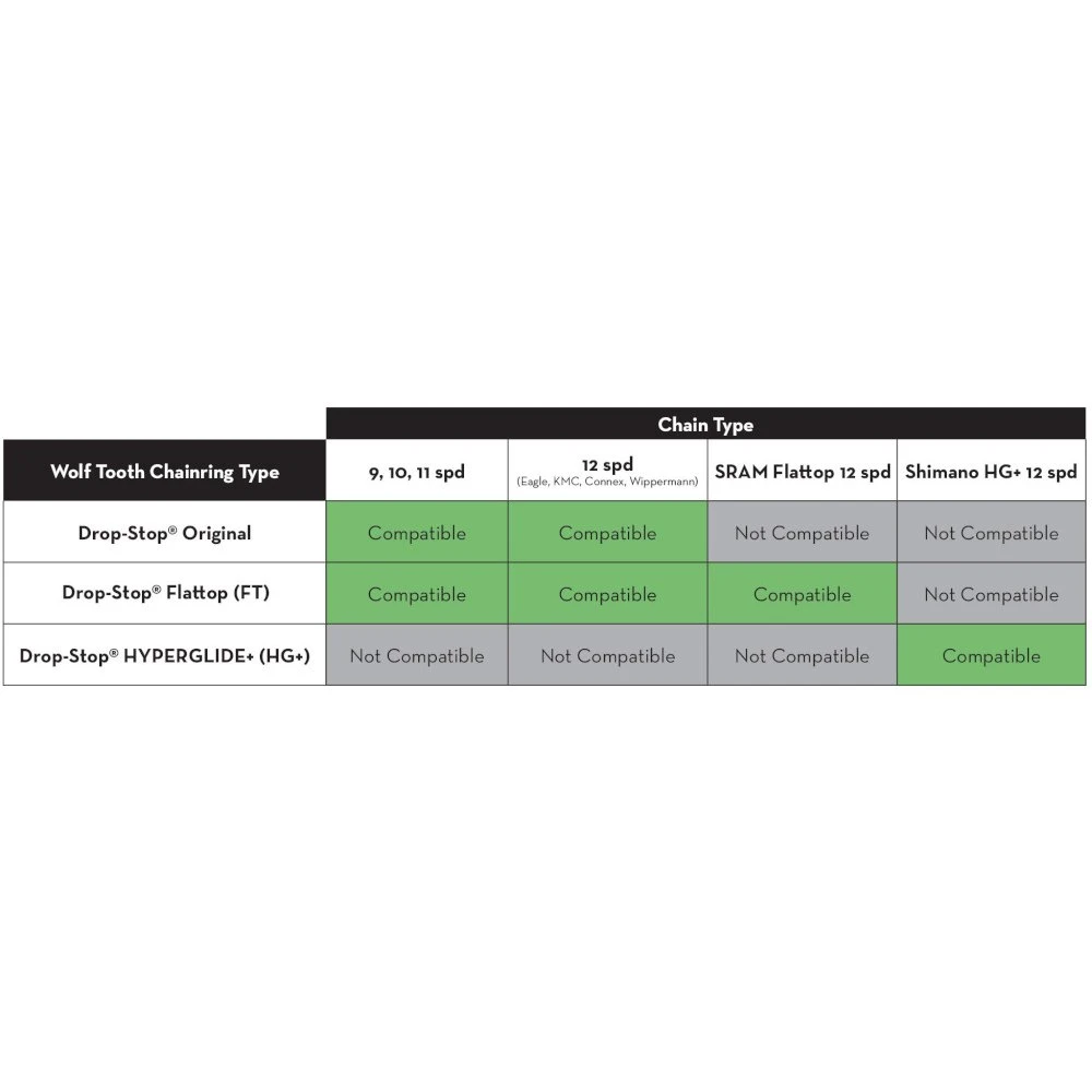- Drop-Stop FT – These chainrings are designed to work with all 10 and 11-speed chains. They also work with 12-speed SRAM Flattop, SRAM Eagle and KMC chain. They do not work with Shimano 12-speed Hyperglide+ chain.