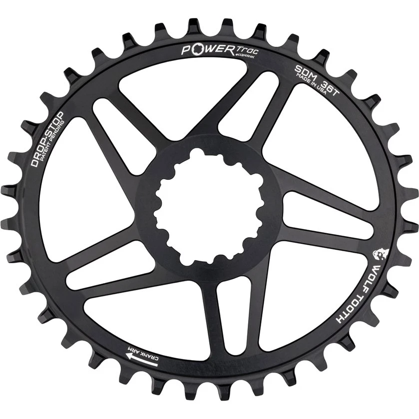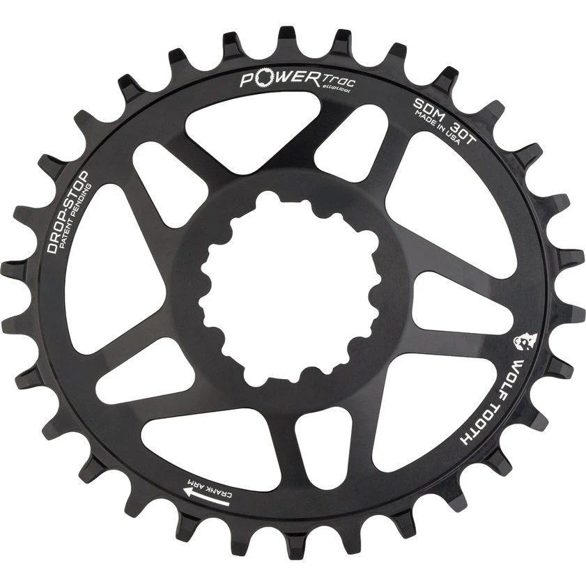 Wolftooth elliptical Direct Mount chainrings with the special Drop-Stop teeth profile for preventing a falling off of the chain.