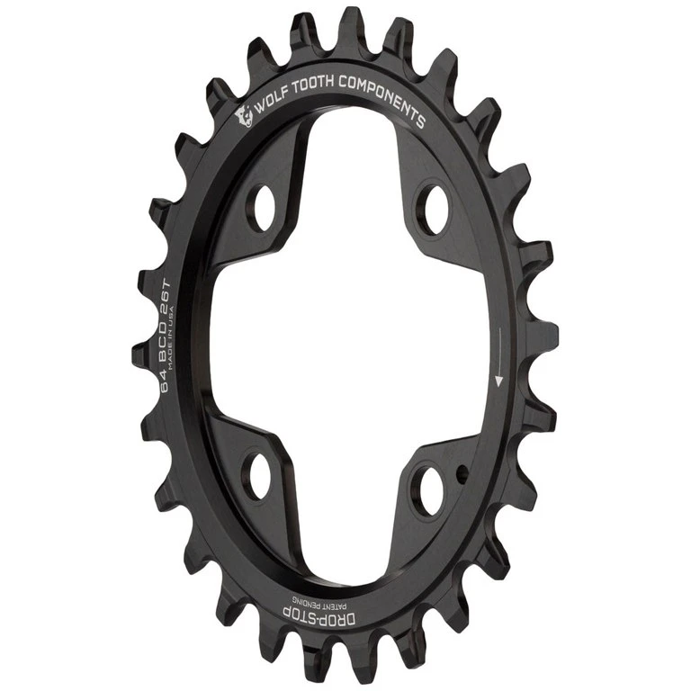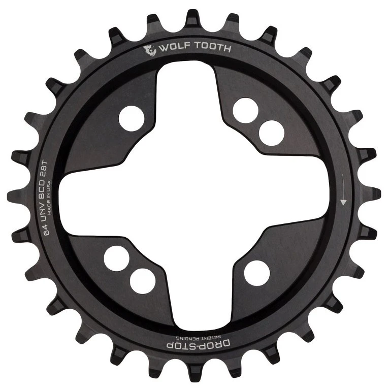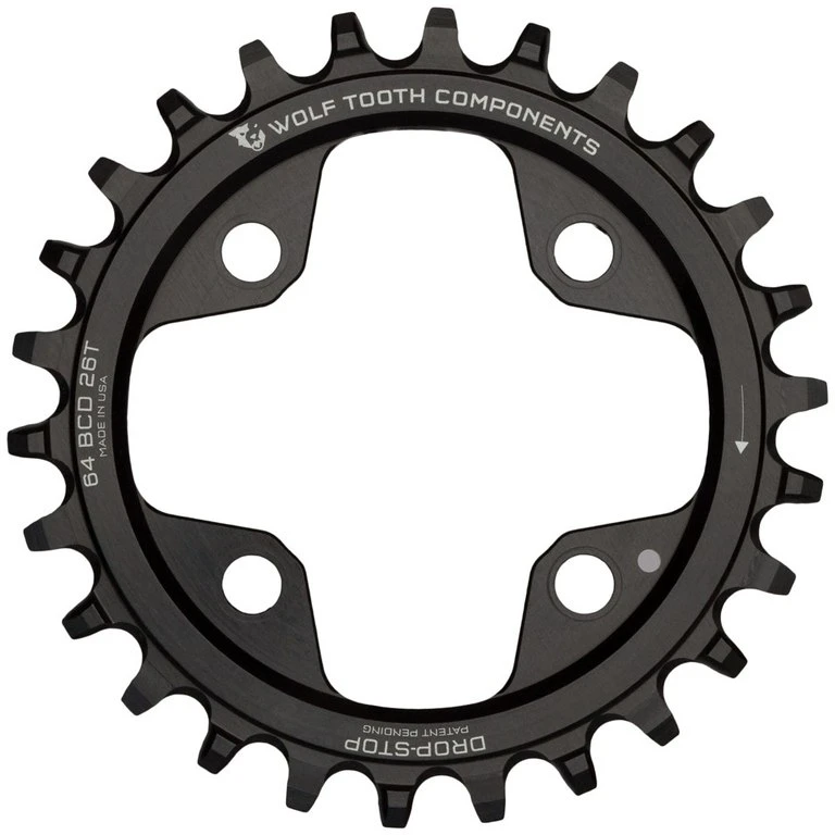Of course the Single chainrings feature the patent-pending Drop-Stop® Narrow Wide tooth design for ultimate chain retention and mud shedding ability. Wolf Tooth recommends to pair the chainrings with the 104 BCD bash ring for best appearance and to protect the 104 BCD spider arms.